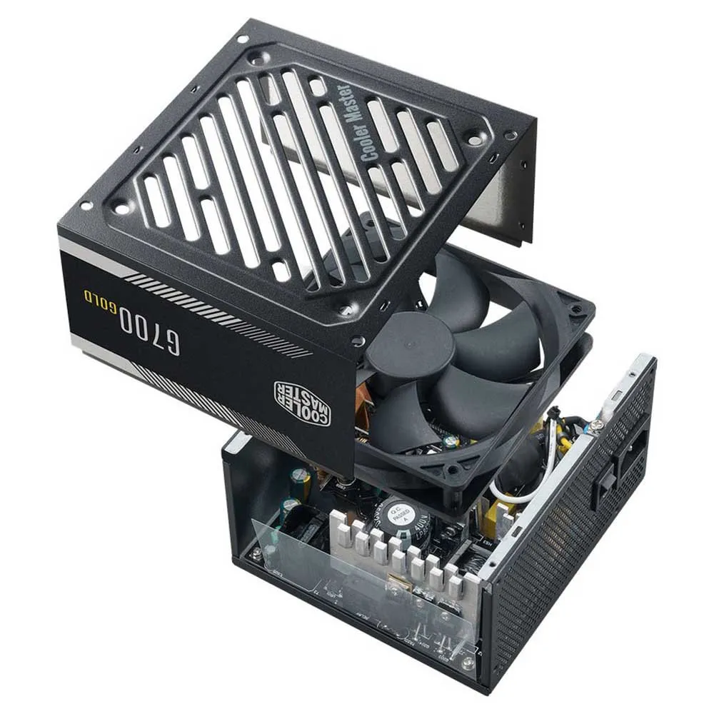 Cooler Master G700 Gold 80+ Gold ATX 700W Ei-modulaarinen virtalähde, aktiivinen PFC, 120mm tuuletinkoko, Hdb-tuuletinlaakeri, 90% tyypillinen kuormitustehokkuus, 80 Plus -luokitus, 1 x ATX-liitin 24 nastaa, 1 4+4-nastainen EPS-liitin, 1 8-nastainen EPS-liitin, 6 SATA-liitintä, 3 4-nastaista oheislaiteliitintä, 4 6+2-nastaista PCI-e-liitintä.