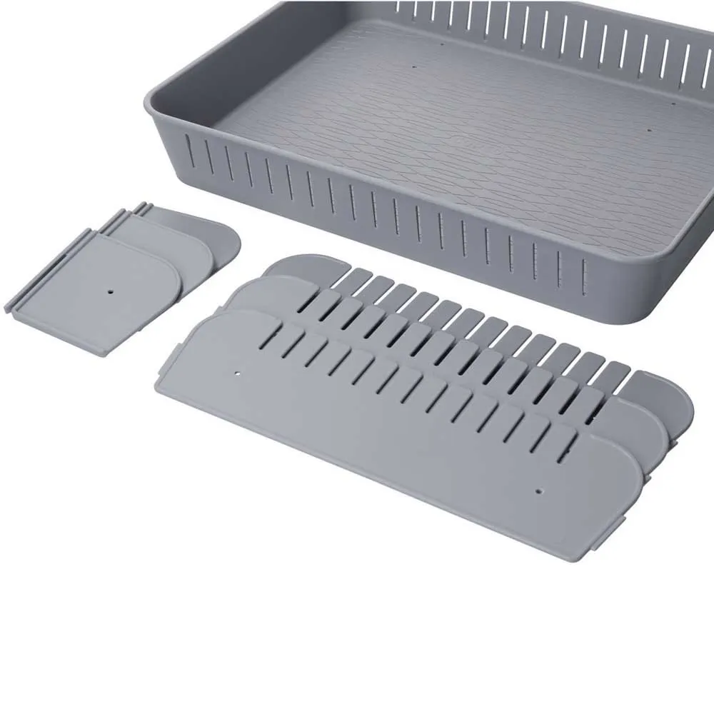 Tämä järjestäjä on suunniteltu kolmen suuren ja kolmen pienen säädettävän väliseinän avulla, ja se on täydellinen ruoan säilytyslaatikoiden erottamiseen kannella tai ilman.
