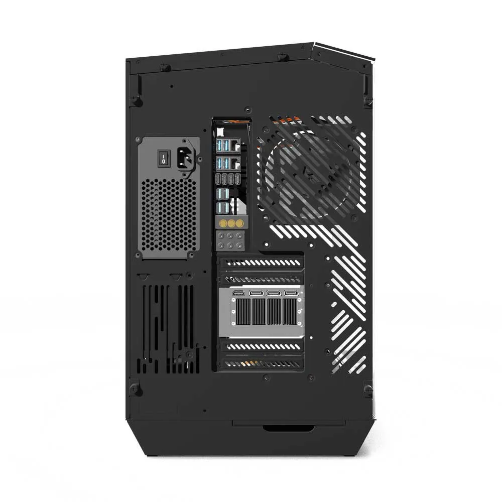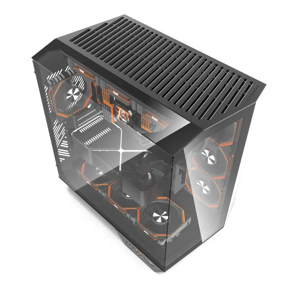 Saranoitu karkaistu lasinen sivupaneeli: Esittele huolellisesti rakennettua kokoonpanoasi kestävällä, kristallinkirkkaalla karkaistulla lasipaneelilla, joka tarjoaa helpon, työkaluttoman pääsyn komponentteihisi. Laaja jäähdytysmonipuolisuus: Tukee useita tuuletin- ja jäähdytinasetelmia, mukaan lukien eteen asennettavat 360 mm:n jäähdyttimet ja lukuisat 120 mm:n tuuletinpaikat koko kotelossa.