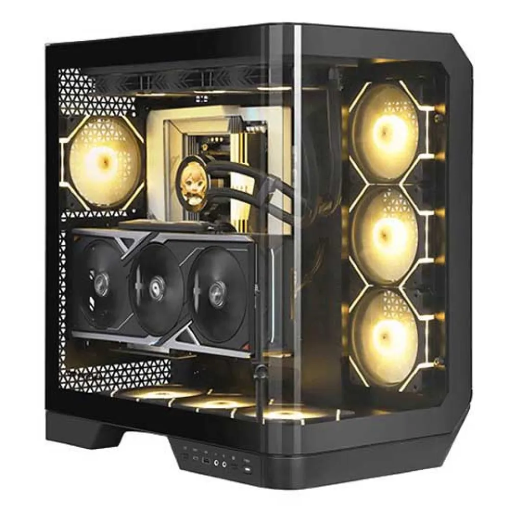 Vertaansa vailla oleva panoraamaesittely: Pylväätön muotoilu kahdella täysikokoisella karkaistulla lasipaneelilla tarjoaa kristallinkirkkaan 270 asteen näkymän sisäiseen laitteistoosi. Se on täydellinen pohja huolellisesti valittujen komponenttien ja eloisten RGB-valaistusjärjestelmien esittelyyn ilman visuaalisia esteitä.