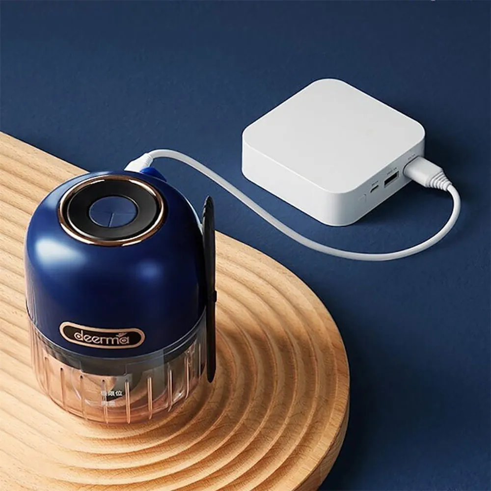DEERMA JS100 Sininen silppuri on pieni laite, joka on suunniteltu helpottamaan pilkkomista ja ruoanvalmistusprosessia.