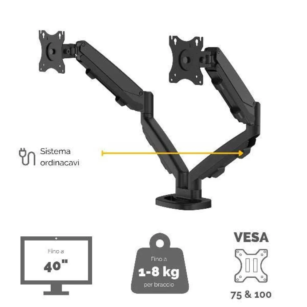- Tukee enintään 39 tuuman kokoisia näyttöjä ja enintään 8 kg painavia näyttöjä per tukivarsi.