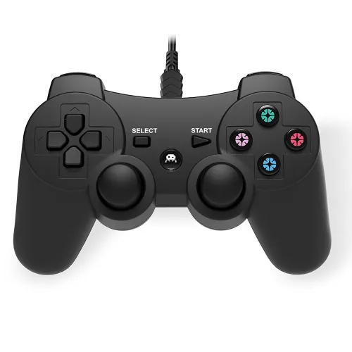 Ohjaimet: Kaksi analogista tattia, suuntanäppäimet, monikosketuslevy, L1/R1/L2/R2-liipaisimet, toimintopainikkeet (kolmio, ympyrä, risti, neliö), SHARE-painike, OPTIONS-painike, PS-painike