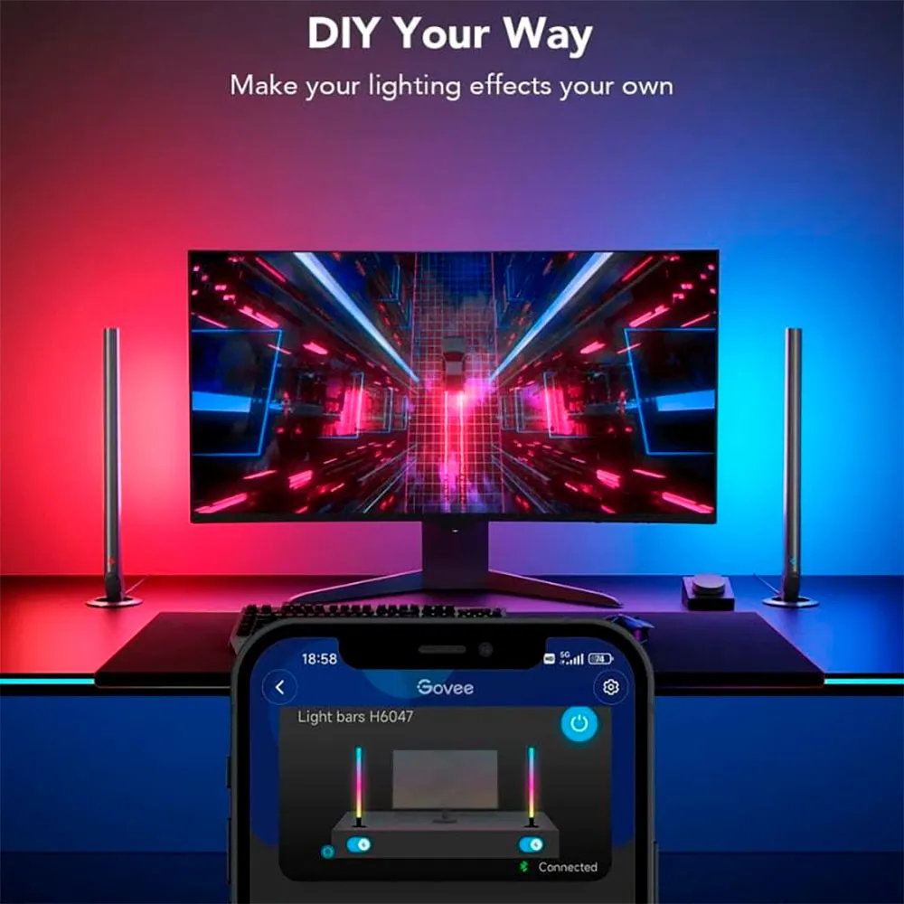 Lisäksi ne synkronoivat valon pelin äänen tai kuvan kanssa ja ne voidaan koordinoida muiden Govee-valaisimien kanssa 360° DreamView -efektin saavuttamiseksi.