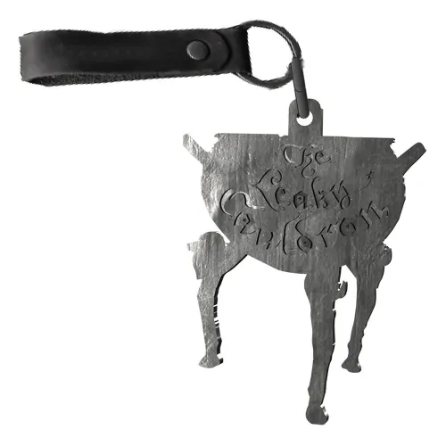 metallinen avainrengas nahkarenkaalla, jossa on symbolinen vuotava kattila -kuviointi.