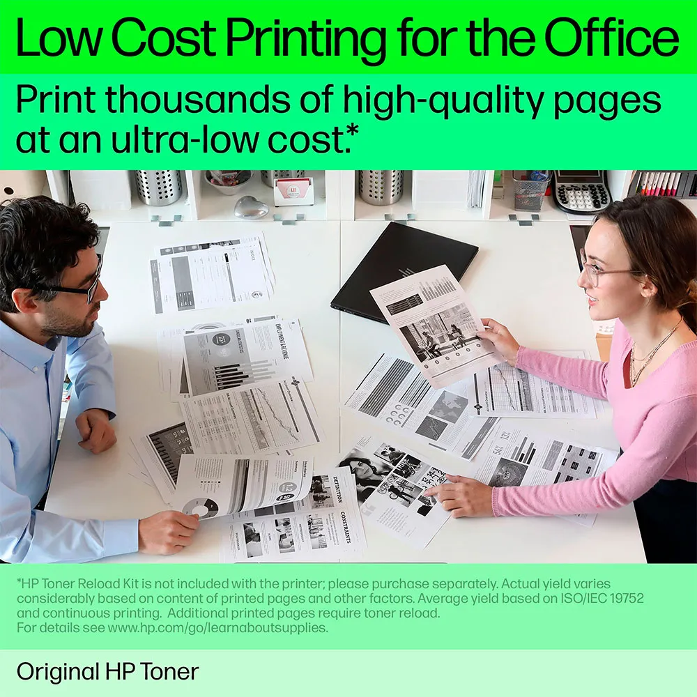 Tulosta tuhansia korkealaatuisia lasersivuja ilman värikasetteja HP:n ainutlaatuisen, puhtaan ja helpon väriaineen täyttöjärjestelmän avulla.