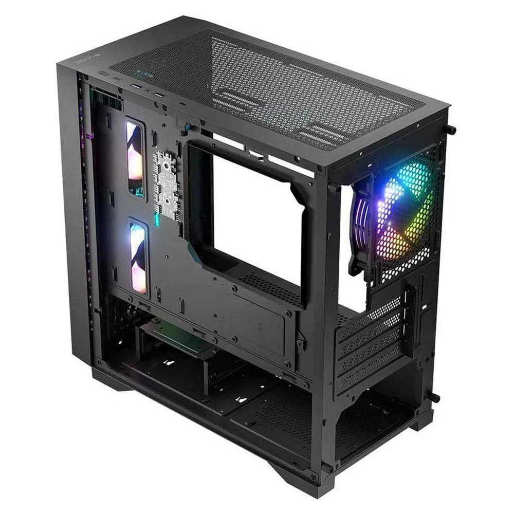 Dart Pro tekee välittömästi vaikutuksen korkean ilmavirran verkkopaneelillaan, joka on suunniteltu imemään mahdollisimman paljon viileää ilmaa ja pitämään kriittiset komponenttisi toiminnassa huipputeholla. Tätä täydentää kaunis, saumaton karkaistu lasinen sivupaneeli, joka tarjoaa kristallinkirkkaan, panoraamanäkymän huolellisesti valitsemaasi laitteistoon ja eloisaan ARGB-valaistukseen.