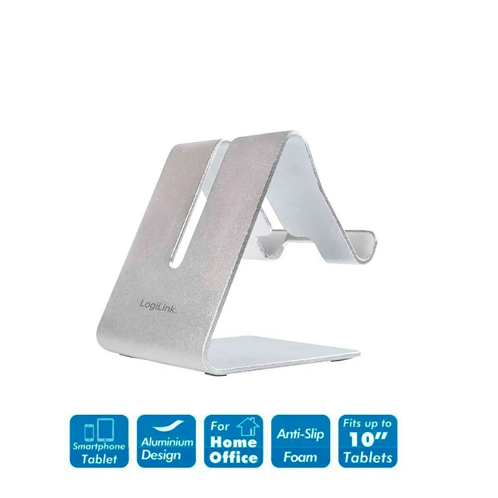 Tuki älypuhelimelle ja tabletille, Logilink Aluminium. Tyylikäs alumiinirakenne, koti- ja toimistokäyttöön, sopii useimpiin älypuhelimiin ja tablet-laitteisiin, liukumaton vaahto suojaa laitetta ja pöytää naarmuilta, kaksi katselukulmaa: pystysuora videokeskusteluun ja vaakasuora työskentelyyn tai lukemiseen - Paino: 0,06 kg.
