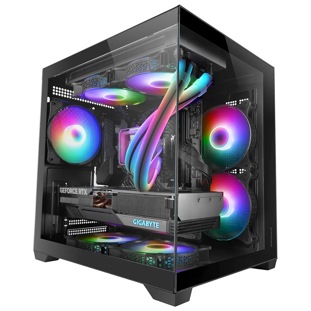 Sen jatkuva karkaistu lasi etu- ja sivupaneeleissa tarjoaa panoraamanäkymän sisätiloihin, esitellen jokaisen komponentin virheettömällä estetiikalla.