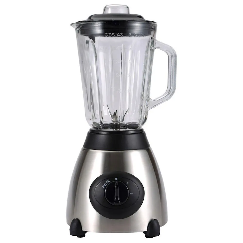 Tämän blenderin kristallipullon tilavuus on 1,5 litraa, ja siinä on kaatoaukko ja mittayksiköt.