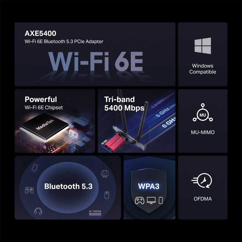 MERCUSYS MA86XE hyödyntää 802.11ax-standardin tehoa, tarjoamalla merkittävästi parannettuja nopeuksia, kapasiteettia ja tehokkuutta verrattuna aiempiin sukupolviin. Avaa internet-yhteytesi täysi potentiaali ja koe langattoman yhteyden tulevaisuus. Tämä PCI-e-sovitin on suunniteltu helppokäyttöiseksi asennukseksi ja yhteensopivaksi laajan valikoiman pöytätietokoneiden kanssa.