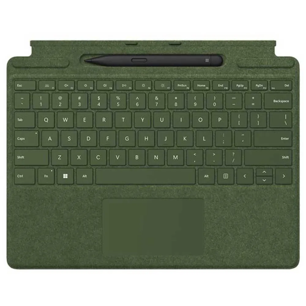 - Signature Keyboard for Surface Pro tuo lämpimän ja mukavan kosketuksen jokapäiväisiin tehtäviin. Uudet Sapphire- ja Forest Signature -näppäimistöt on valmistettu osittain biohajoavasta Alcantara®-materiaalista, joka sisältää vähintään 12 % sokeriruokojätteestä peräisin olevaa uusiutuvaa sisältöä.