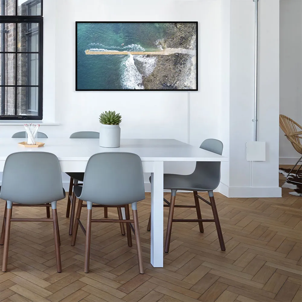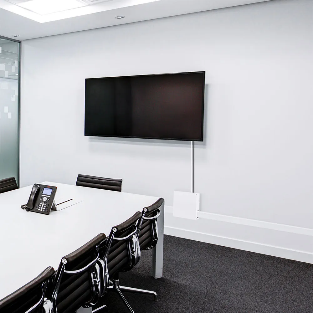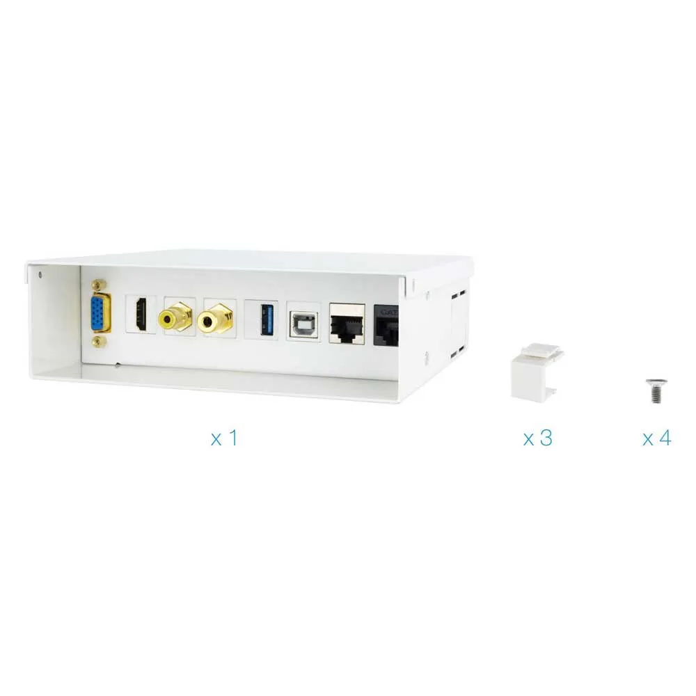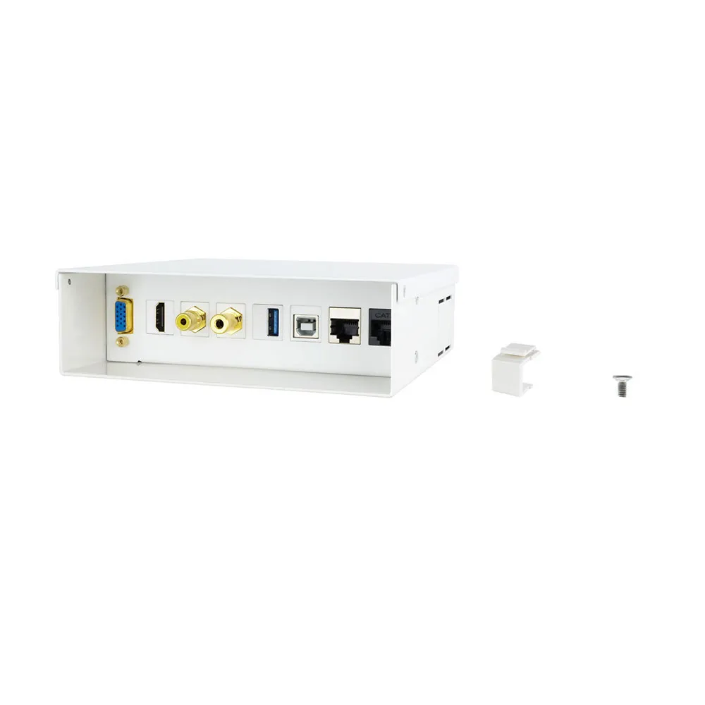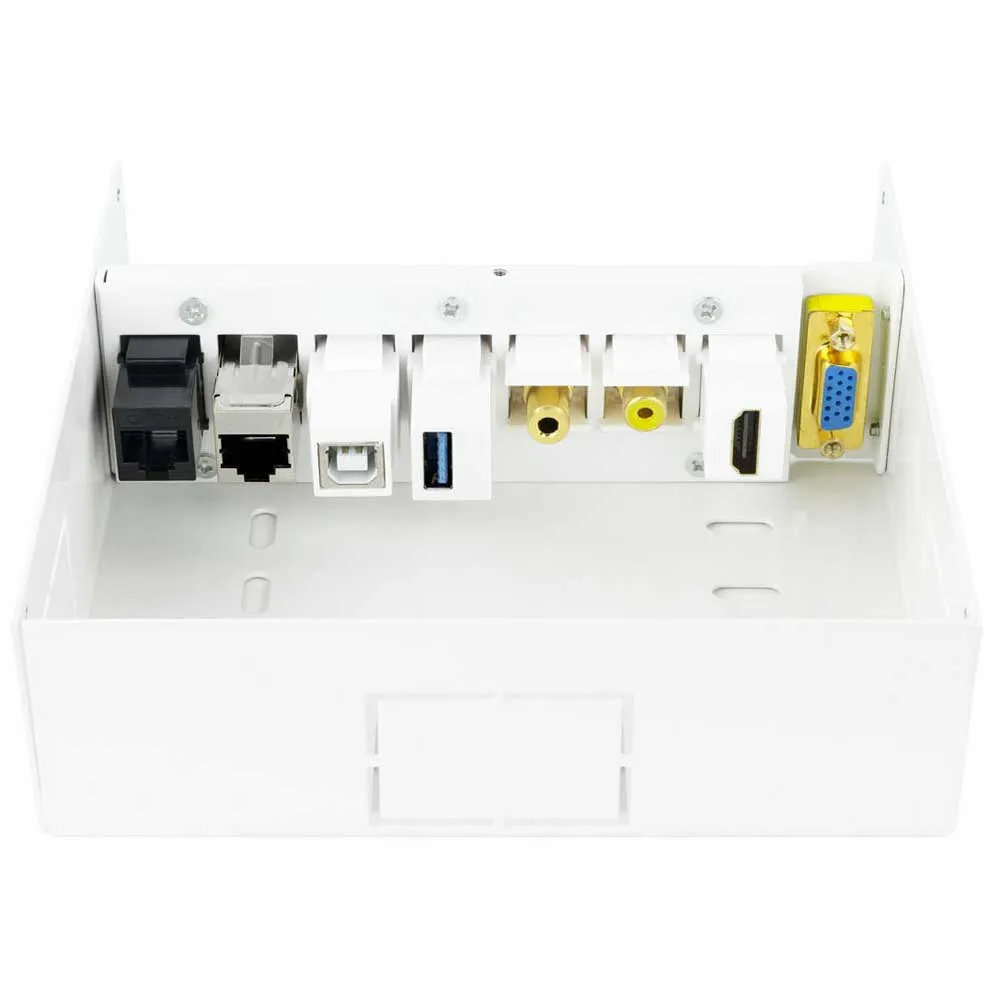 Multimedia-seinäliitäntälaatikko, jossa on VGA, HDMI, JACK3.5, RCA, USB2.0 B, USB 3.0 ja 2 x RJ45, valkoinen.