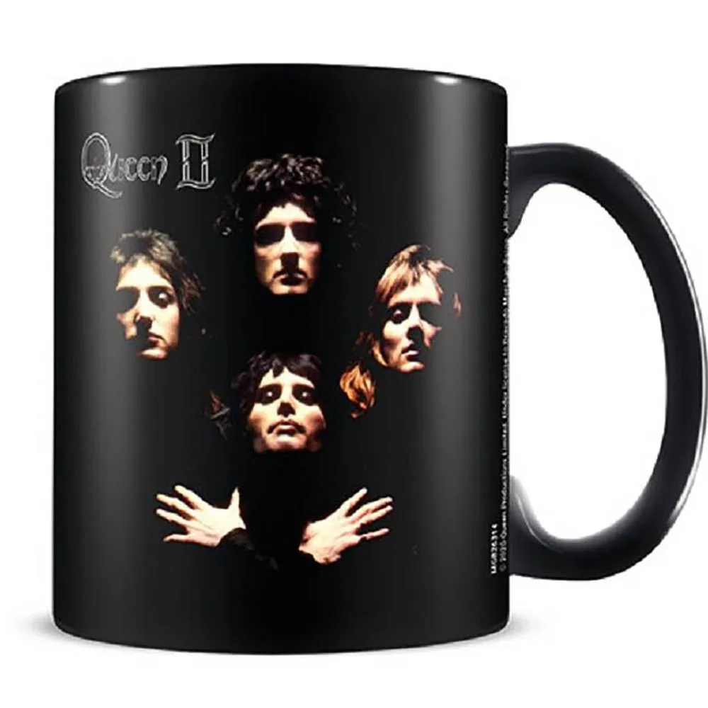 Tässä upeassa aamumukissa on legendaarinen ja välittömästi tunnistettava kuvitus Queenin vuoden 1974 mestariteosalbumilta "Queen II". Jyrkkä, korkeakontrastinen kuva, jonka on ottanut valokuvaaja Mick Rock, vangitsee Freddie Mercuryn, Brian Mayn, Roger Taylorin ja John Deaconin asennossa, joka määrittelisi heidän imagoaan vuosien ajan. Muotoilu on huolellisesti toistettu poikkeuksellisella selkeydellä ja yksityiskohdilla, mikä varmistaa, että alkuperäisen valokuvan voimakas olemus säilyy. Mugin syvä, kiiltävä musta pinta tarjoaa täydellisen pohjan, mikä saa ikonisen valkoisen ja mustan kuvaston ponnahtamaan esiin dramaattisella teholla.