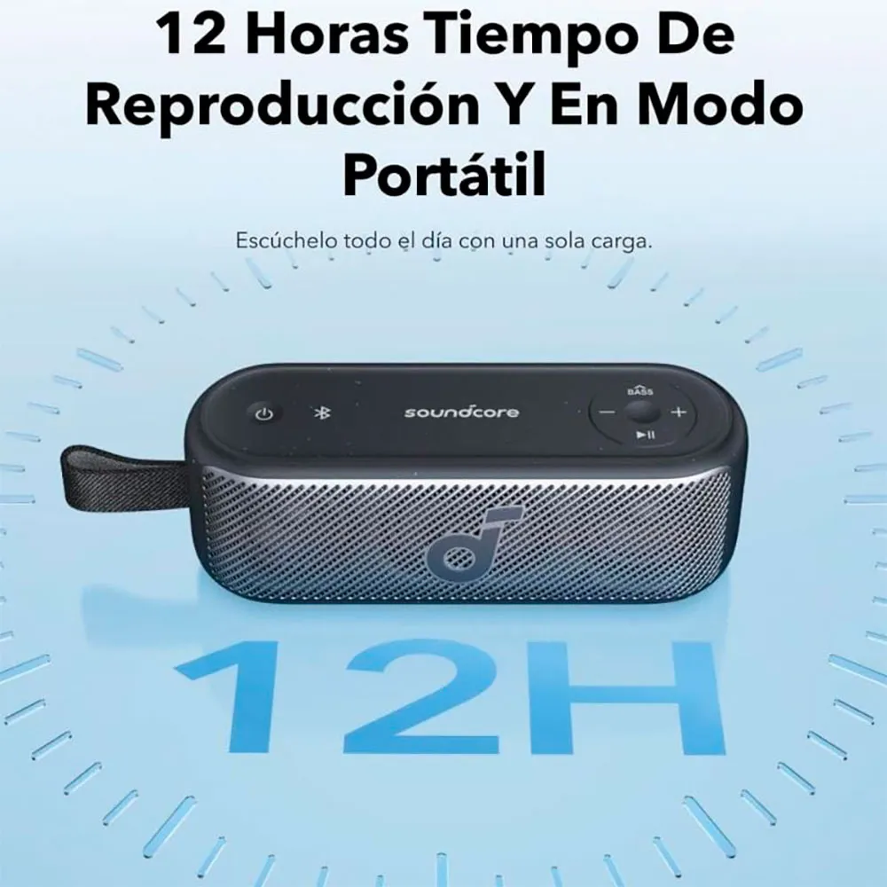 Sen erittäin kannettava muotoilu sisältää hihnan, on vedenkestävä (IPX7) ja tarjoaa 12 tunnin akunkeston.