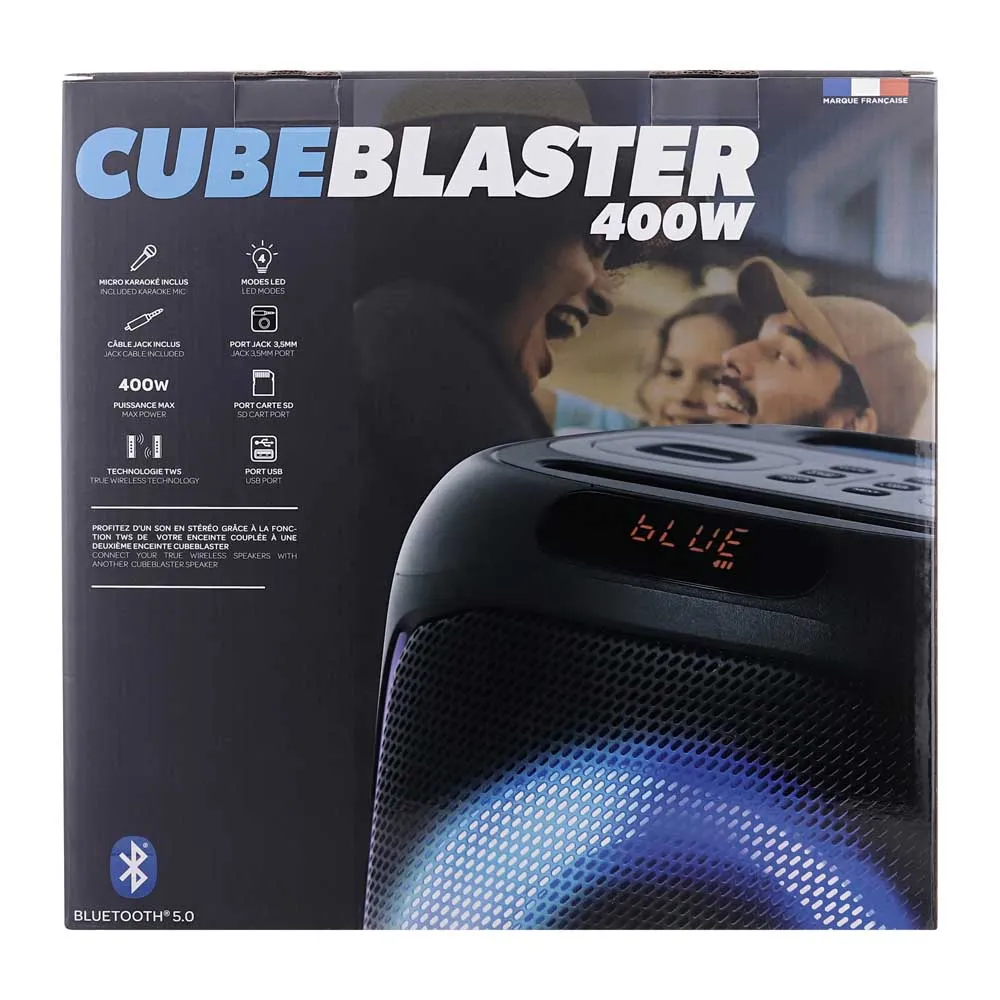 BLASTER-sarjan avulla räjäytä musiikin rajat. CUBE BLASTER tarjoaa sinulle unohtumattomia hetkiä: hulluja iltapäiviä tai villejä iltoja. 40 watin RMS-teho miniatyyri, kevyt ja neliönmuotoinen, käsin kannettava laite: optimaalinen teho-painosuhde. Käytä Bluetooth-yhteyttä ja kaiuttimen päällä olevaa puhelintelinettä. Voit myös liittää laitteen 3.5 mm:n liitäntäportin kautta jakkikaapelilla; tai käyttää USB-porttia tai SD-korttipaikkaa.