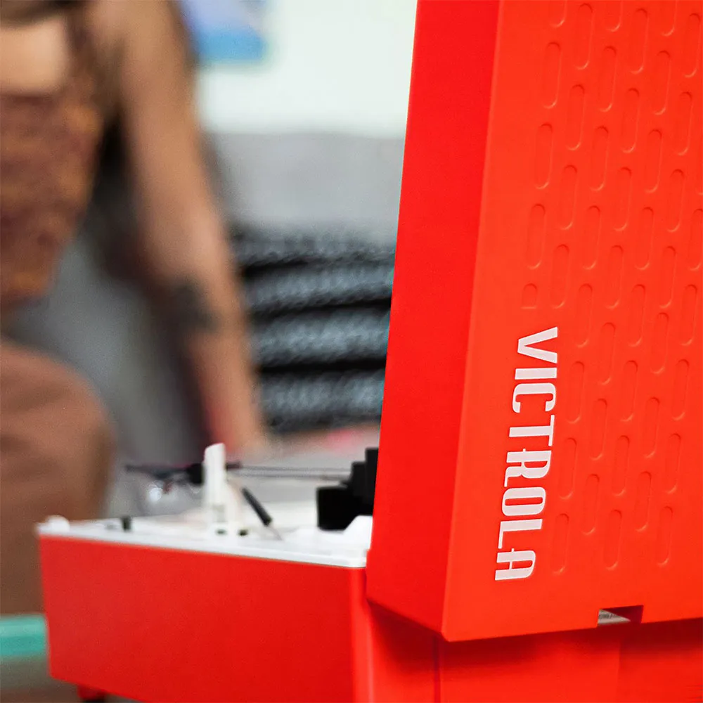 Koe musiikki klassisella tavalla Victrola Re-Spin punaisella matkalaukkusoittimella, joka on moderni versio ikonisesta kannettavasta levysoittimesta.
