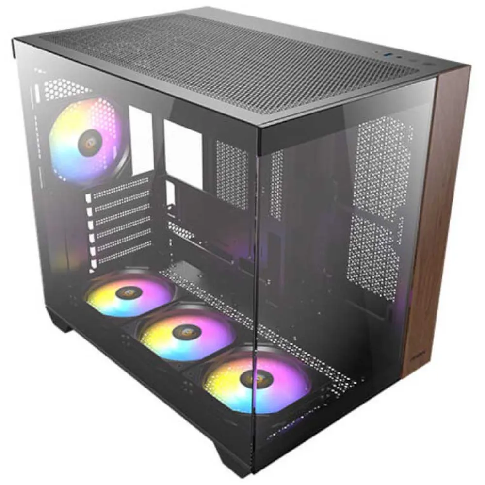 Affichage Panoramique en Verre à 270° : Deux panneaux en verre trempé à l´avant et sur le côté offrent une vue ultra-large et homogène de l´intérieur de votre construction, parfaite pour mettre en valeur l´éclairage RGB et les composants haut de gamme.