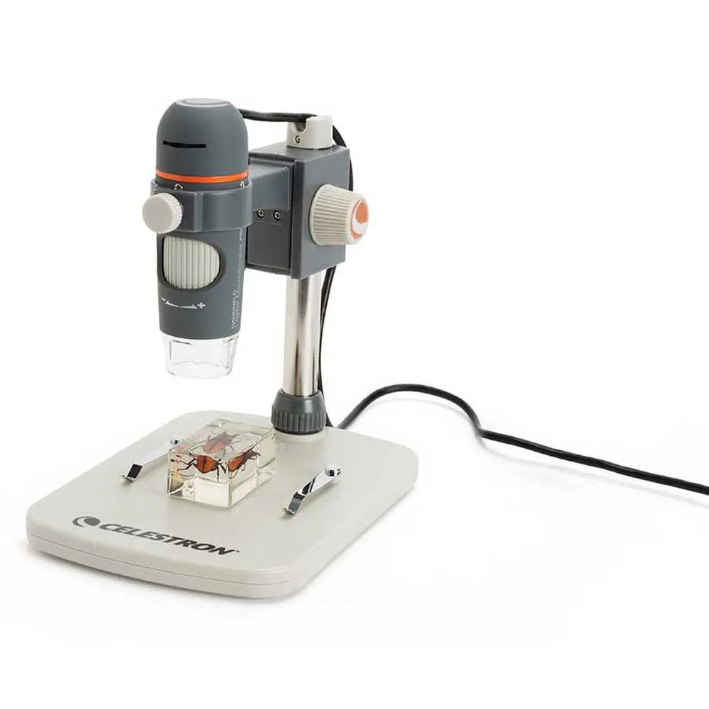 Le microscope numérique portable Pro de Celestron est un microscope facile à utiliser et de faible puissance, doté d´un capteur de 5.0 MP pour capturer des photos et des vidéos de vos découvertes.