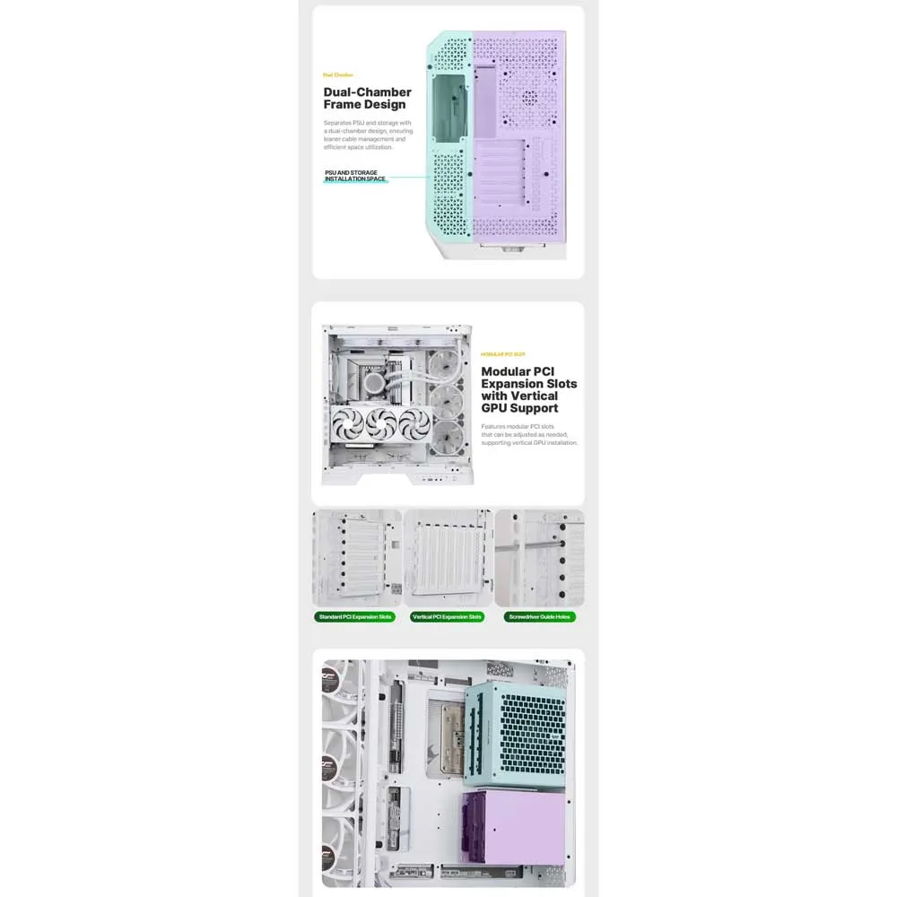 Le DY570 est conçu pour l´excellence, offrant une plateforme spacieuse et polyvalente pour les configurations les plus ambitieuses. Sa disposition intelligente à double chambre sépare les principaux composants générant de la chaleur de l´alimentation et des disques de stockage, ce qui se traduit par un aspect plus propre et une efficacité thermique considérablement améliorée. Cette conception simplifie non seulement la gestion des câbles pour un intérieur impeccable, mais garantit également que l´air frais est dirigé précisément là où il est le plus nécessaire.