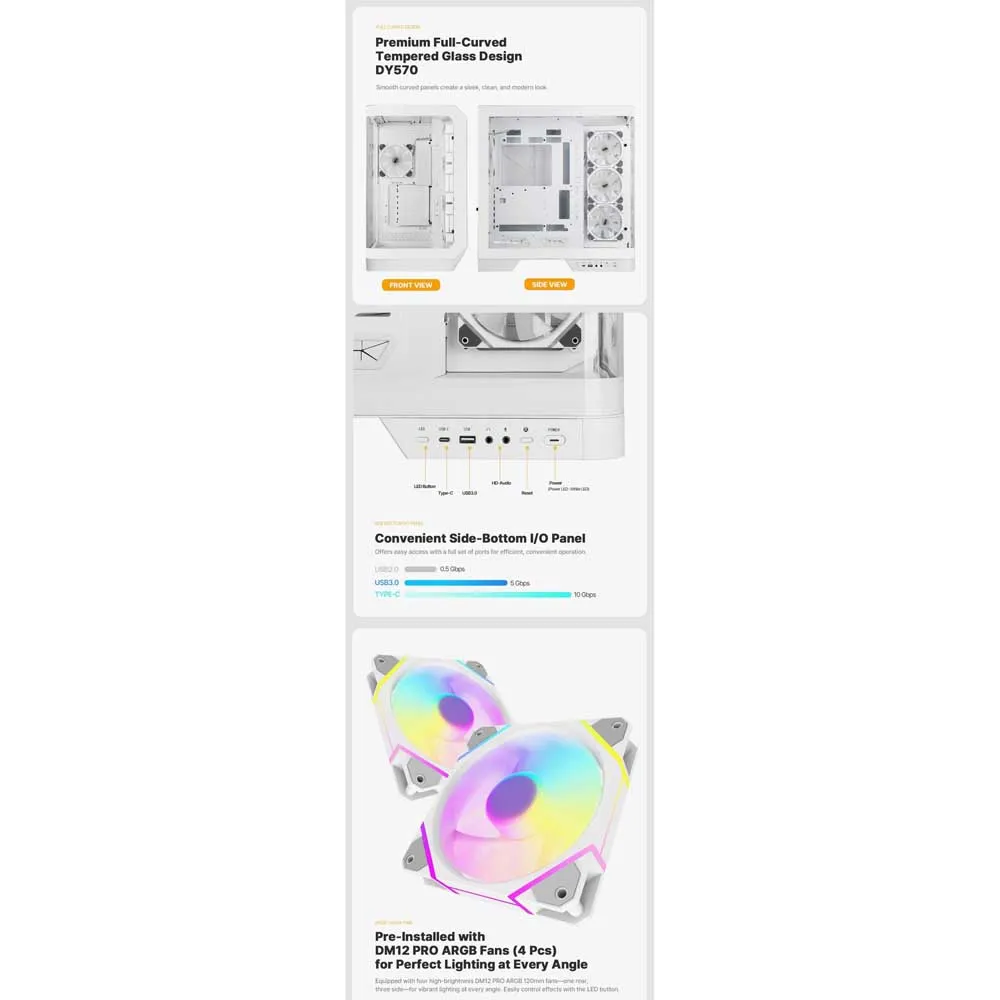 Intérieur spacieux et polyvalent : En tant que grand boîtier de milieu de tour, le DY570 offre amplement d´espace pour le matériel haute performance. Il peut accueillir confortablement des cartes mères ATX de taille normale, des cartes graphiques extra-longues jusqu´à 410 mm et de grands refroidisseurs d´air pour CPU. Cet espace généreux garantit une expérience de construction facile et agréable sans compromis.