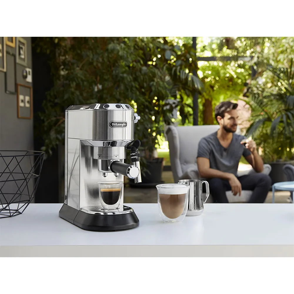 Préparez un café de qualité barista chez vous avec l´élégante De´Longhi EC685. Son corps ultra-mince de 15 cm en acier inoxydable s´adapte à n´importe quel espace. La pompe à pression de 15 bars et la technologie Thermoblock fonctionnent en tandem pour offrir un espresso authentique avec une crème riche et parfaite, à partir de votre café moulu préféré ou de dosettes ESE. Libérez le barista qui sommeille en vous grâce au système Cappuccino réglable pour créer des cappuccinos et des lattes crémeux. Le double égouttoir amovible peut accueillir des tasses plus hautes jusqu´à 12 cm. PRISE EU