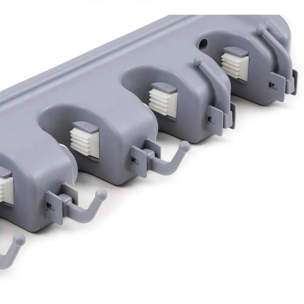Porte-ustensiles de nettoyage qui vous permet d´organiser votre cuisine ou votre pièce de rangement de manière pratique et d´économiser de l´espace. Idéal pour suspendre les balais, les serpillières, les pelles à poussière, ainsi que les torchons de cuisine grâce à ses 4 fentes et 5 crochets. Les fentes sont équipées de billes à rouleaux qui s´adaptent à l´épaisseur du manche du balai ou de la serpillière et les maintiennent fermement. Les détacher est très facile, il suffit de soulever légèrement le manche du balai. Très facile à installer avec des vis incluses. Fabriqué en plastique très résistant avec une finition grise.