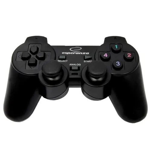 Manette de jeu à vibration utilisable pour ordinateurs PC. Excellent fonctionnement avec les jeux avancés. La conception ergonomique facilite la prise en main et ne provoque pas de fatigue des mains pendant le jeu. 2 joysticks analogiques, 12 boutons d´action (dont 2 boutons sur les joysticks), 2 modes (analogique et numérique) et 8 boutons directionnels pour un accès facile à la plupart des jeux. Les moteurs vibrants produisent des effets supplémentaires générés par le jeu. Installation facile.