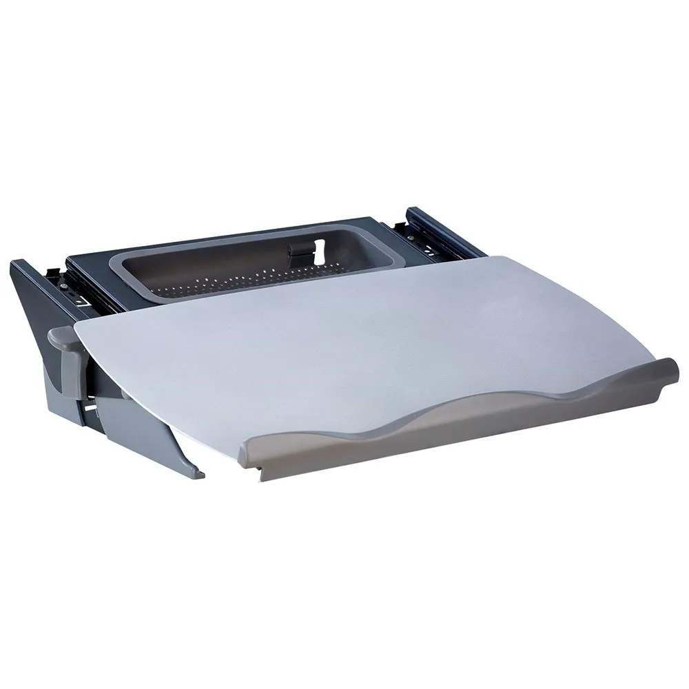 La plateforme glisse vers l'avant en continu pour couvrir le clavier et créer un coussin de bureau ergonomique