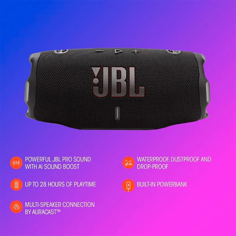 Profitez d´un son puissant et sans distorsion avec la JBL Charge 6. Sa technologie AI Sound Boost analyse la musique en temps réel pour une clarté et des performances acoustiques inégalées. Profitez de jusqu´à 28 heures d´autonomie, ou obtenez 150 minutes de musique avec une charge rapide de 10 minutes. Conçue pour toutes les aventures, elle est désormais étanche à l´eau et à la poussière (IP68) et résistante aux chutes. Connectez plusieurs enceintes avec Auracast™, personnalisez votre son avec l´application JBL Portable et gardez vos appareils chargés grâce à sa batterie externe intégrée. Avec son design audacieux et portable, la Charge 6 est votre compagnon sonore ultime