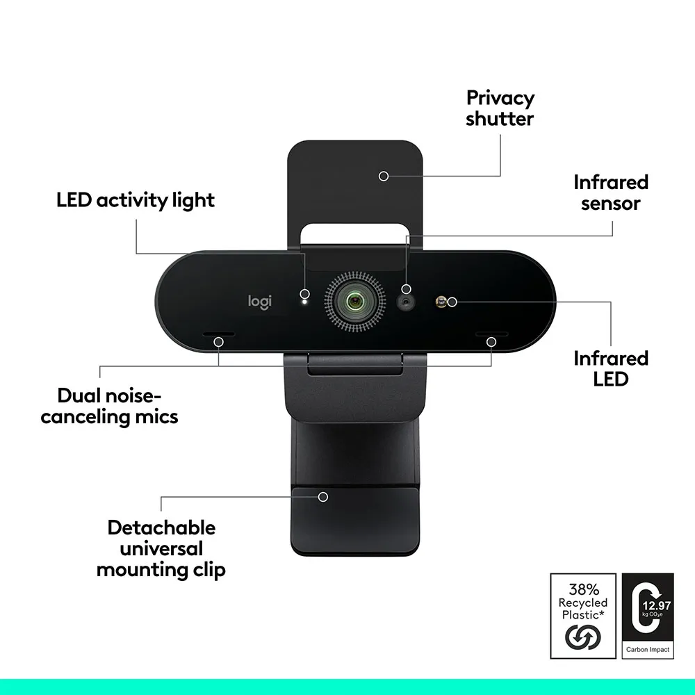 La sécurité et la commodité sont intégrées. La Logitech Brio est dotée de capteurs optiques et infrarouges intégrés, offrant une reconnaissance faciale rapide et sécurisée pour Windows Hello. Connectez-vous à votre ordinateur d´un simple regard. Deux microphones omnidirectionnels intégrés avec technologie de suppression du bruit capturent clairement votre voix jusqu´à un mètre de distance, garantissant que votre audio est aussi professionnel que votre vidéo sans avoir besoin d´un casque séparé.