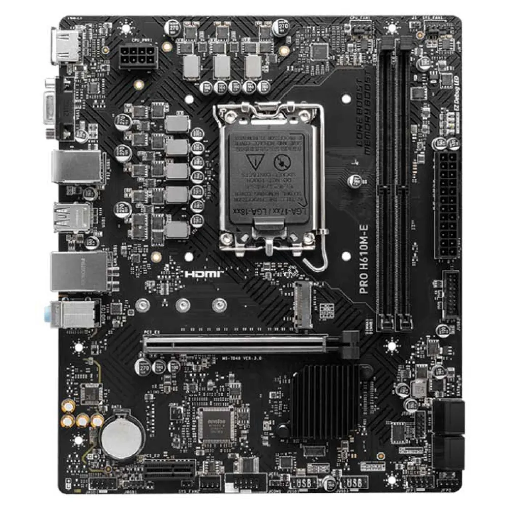 Bénéficiez de performances stables et de solutions professionnelles intelligentes avec la carte mère MSI PRO H610M-E DDR4. Conçue pour l´efficacité, cette carte micro ATX prend en charge les derniers processeurs Intel Core sur le socket LGA 1700. Optimisez votre productivité avec jusqu´à 64 Go de mémoire DDR4 double canal et profitez d´un accès rapide aux données grâce aux options de stockage M.2 et SATA III pour les SSD et les HDD. Dotée du Gigabit LAN, de l´USB 3.2 Gen 1 et du HDMI 2.1, elle offre toute la connectivité essentielle pour une configuration PC fiable et professionnelle, complétée par un son HD 7.1 canaux