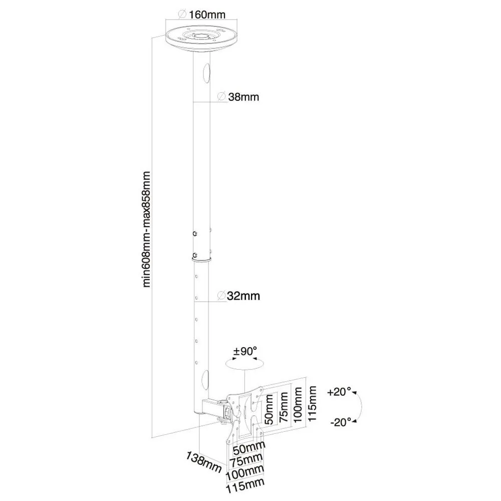 Newstar fpma c050silver a deux points de pivotement et convient aux écrans jusqu'à 30´´ (76 cm). la capacité de poids de ce produit est de 20 kg. le support de plafond convient aux écrans qui répondent au modèle de trou vesa 50x50 ou 100x100mm. différents modèles de trous peuvent être recouverts à l'aide de plaques d'adaptation newstar vesa.