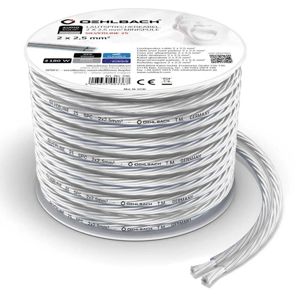 Câble de haut-parleur stéréo parfaitement fabriqué enroulé sur une mini bobine. Ce câble de haut-parleur convient aux performances d'amplificateur allant jusqu'à environ 120 watts de puissance par canal d'amplificateur. L'utilisation de cuivre sans oxygène plaqué argent (Ofc) comme matériau conducteur garantit qu'un son extrêmement clair et fidèle à la réalité peut être obtenu avec ce câble de haut-parleur. L'utilisation de l'argent pour affiner ce câble permet d'améliorer encore la reproduction des aigus. Le câble a également été fabriqué à partir de très nombreux fils de cuivre toronnés ultrafins - chaque fil individuel possède une section transversale d'environ 0,125 mm. Cette conception complexe signifie que le câble est particulièrement conducteur et flexible.