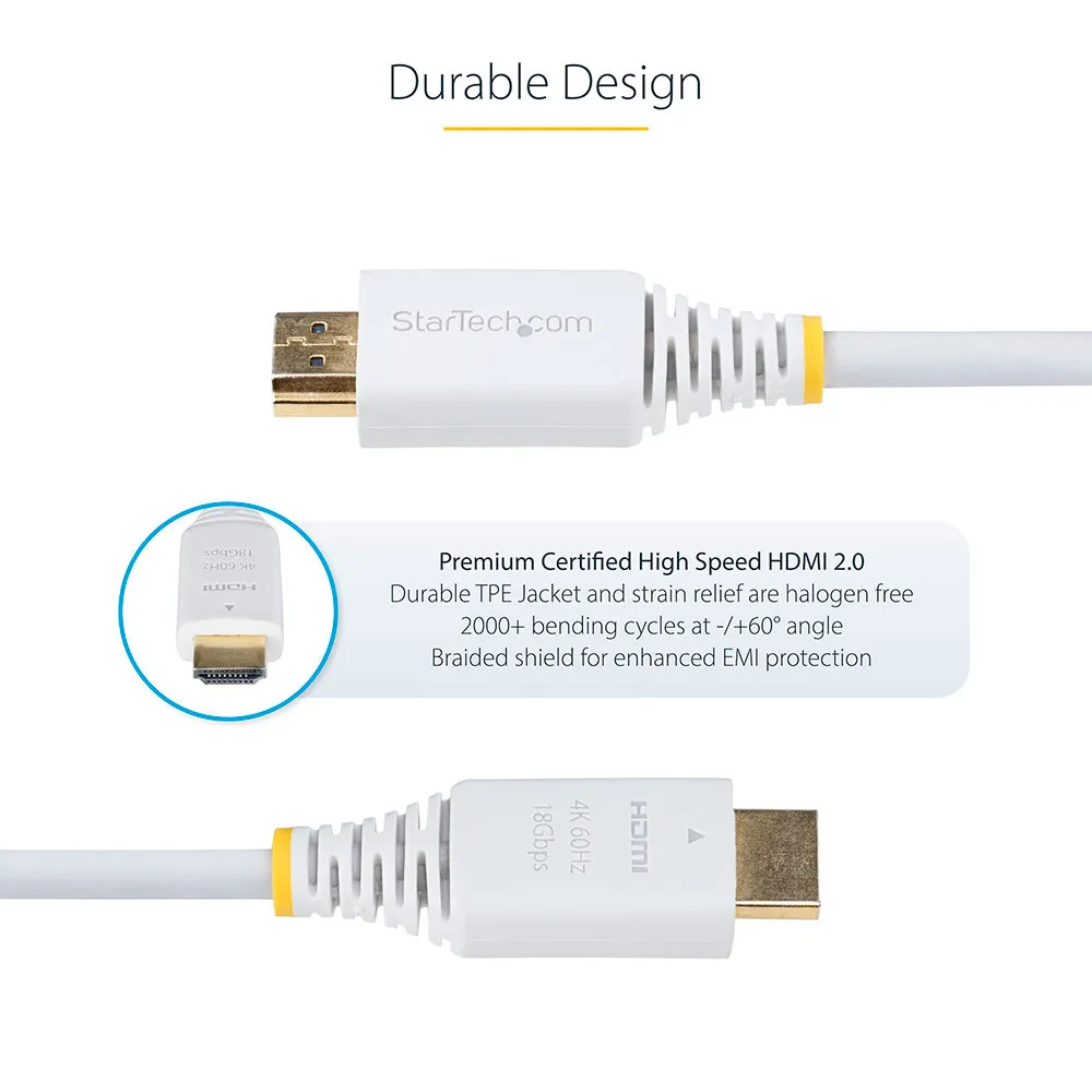 Câble HDMI haute vitesse certifié Premium StarTech.com 6 pi (1.8 m), 4K 60 Hz/1440p 144 Hz, HDR10/HDCP 2.2/ARC, 18 Gbit/s, cordon HDMI 2.0 UHD pour téléviseur/moniteur/écran, gaine TPE, blanc.