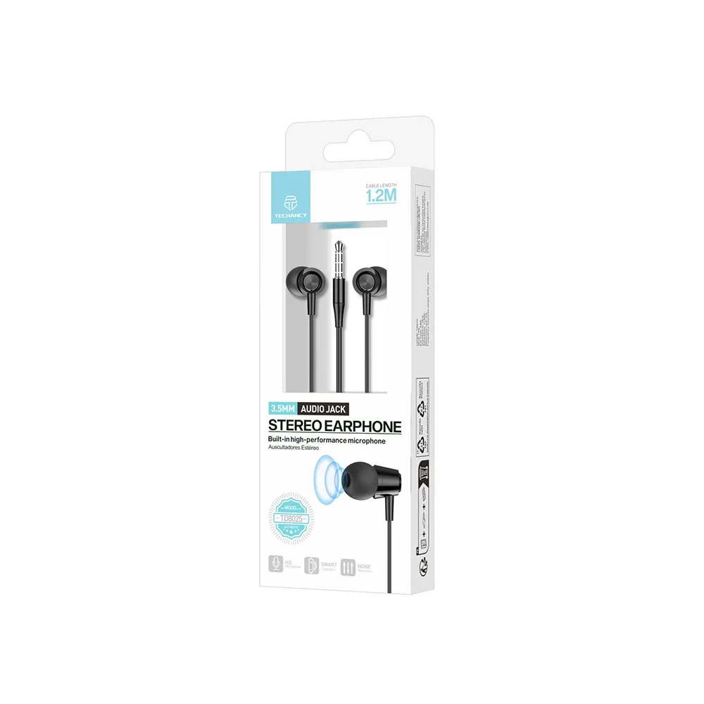 Écouteurs stéréo 3.5 mm Techancy TD8025 avec microphone, conception intra-auriculaire filaire de 1.2 m. Compatibles avec tous les appareils dotés d´une prise audio 3.5 mm, se connectant facilement aux téléphones portables, tablettes, ordinateurs et plus encore pour répondre à divers scénarios d´utilisation.