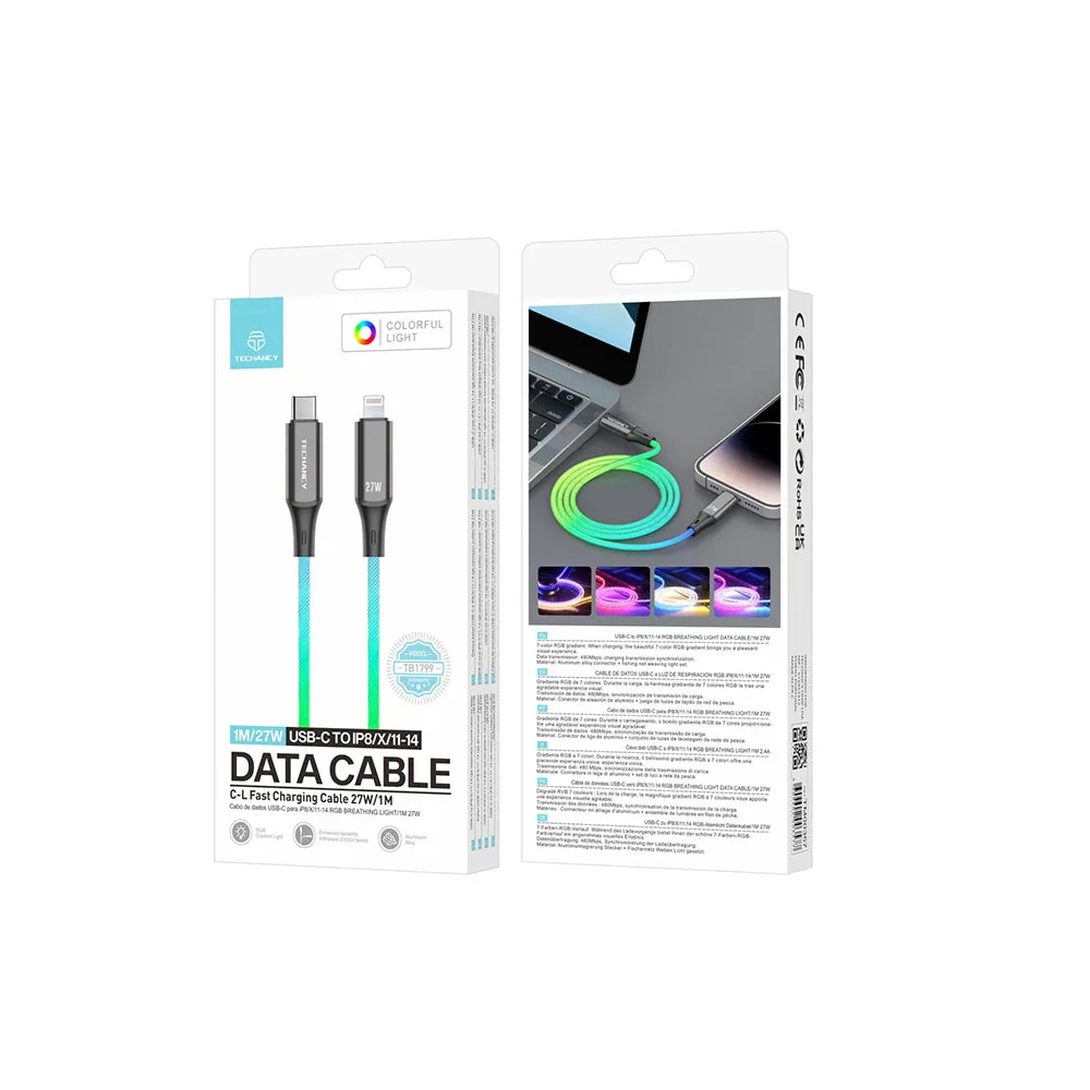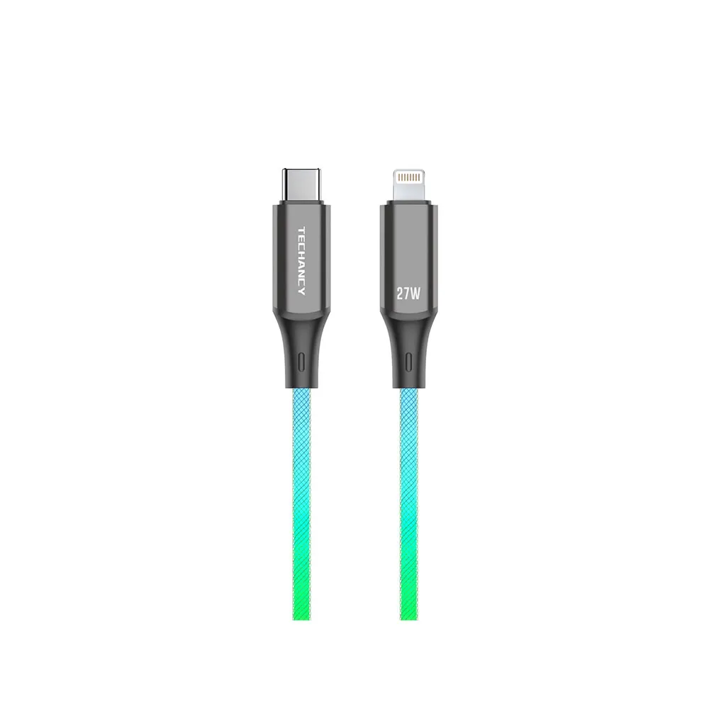 Câble de données de charge rapide Techancy USB-C vers iP8/X/11 - 14, il est équipé d´une magnifique lumière respiratoire RVB sept couleurs. Lors de la charge, il produit une lumière ambiante colorée, et la vitesse de transmission efficace permet de transférer instantanément des données telles que des documents, des photos, des vidéos et de la musique. La charge et la transmission peuvent être effectuées simultanément.