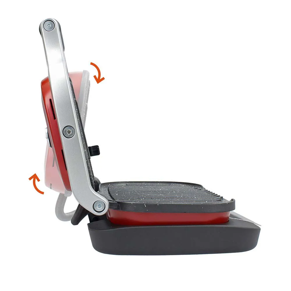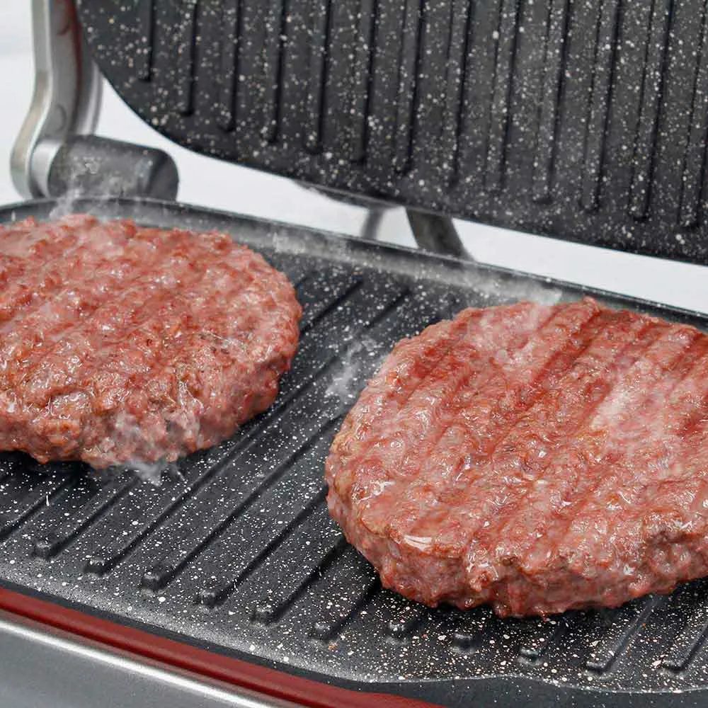 - Grâce à son contrôle de la hauteur, vous pouvez parfaitement régler les 2 plaques des deux côtés de la nourriture.