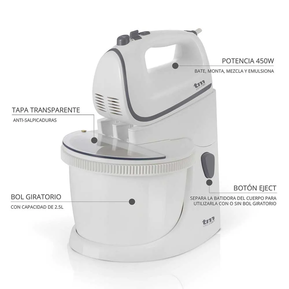 Son puissant moteur de 450 W et ses 5 vitesses ainsi que ses différentes tiges et crochets pour battre ou pétrir vous faciliteront le travail de préparation de la pâte.