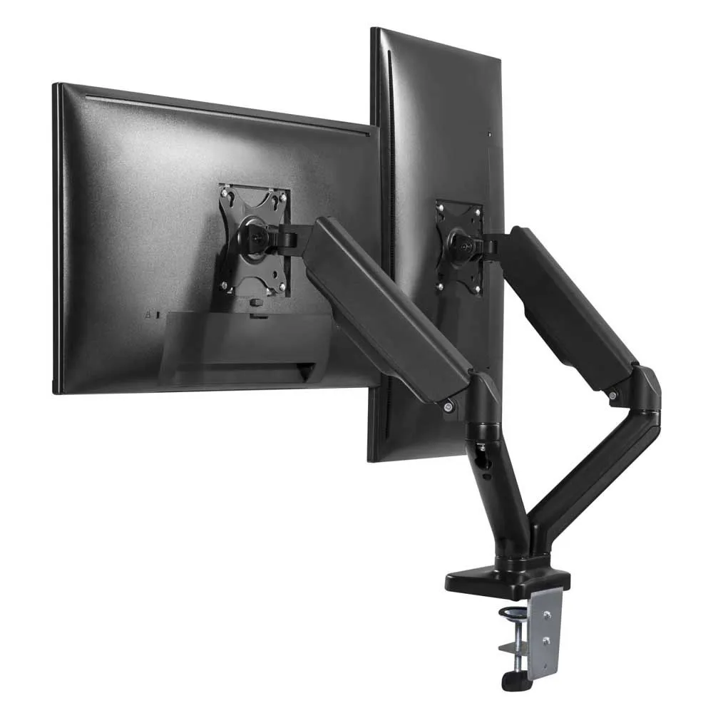 Bras double écran avec articulation complète et réglage à 360°. Le bras double écran articulé est la solution optimale pour l´installation de vos deux écrans. Il vous permet d´ajuster en continu la position de vos moniteurs, en hauteur, en profondeur et en largeur. Profitez d´une liberté totale de placement, travaillez debout ou assis ou tournez vos écrans pour présenter du contenu à un collègue. Tout est possible. Le bras double vous permet de positionner vos 2 écrans librement et d´améliorer votre confort de travail. Son ressort à gaz vous permet d´ajuster la position et de contrebalancer le poids de l´écran avec précision. Passe-câbles intégré au corps du bras pour faciliter le rangement du bureau et libérer de l´espace. Deux options de montage intégrées : vis de serrage et kit de perçage.