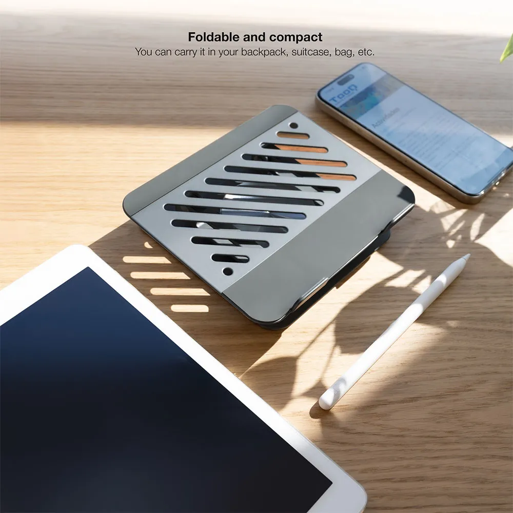 Conçu pour la portabilité, ce support de tablette est doté d´un cadre entièrement pliable et compact. Il se replie en un profil mince, ce qui le rend incroyablement facile à glisser dans un sac à dos, une sacoche d´ordinateur portable ou même une grande poche. Emportez-le avec vous de votre bureau à domicile à votre lieu de travail, lors de voyages d´affaires ou à votre café préféré. Des patins antidérapants protecteurs sont stratégiquement placés sur la base et le berceau de l´appareil pour maintenir le support fermement en place sur n´importe quelle surface et pour protéger votre précieuse tablette des rayures et des éraflures.