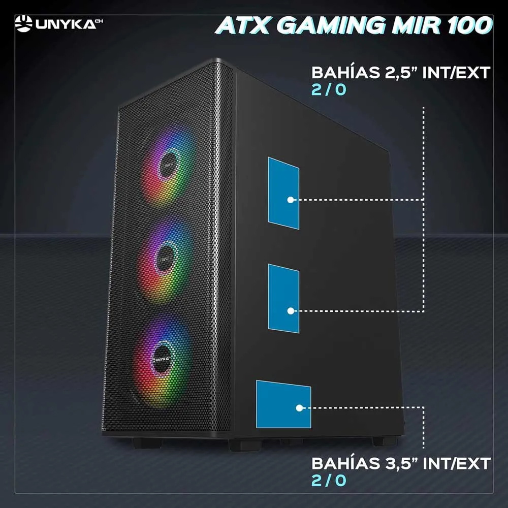 La tour ATX UNYKACH Mir100 offre un rapport qualité-prix exceptionnel aux joueurs et aux créateurs. Son design épuré et minimaliste est sublimé par un panneau latéral en verre trempé et quatre ventilateurs ARGB préinstallés, offrant une esthétique époustouflante et un refroidissement efficace dès le départ. L´intérieur spacieux offre une polyvalence impressionnante, prenant en charge les cartes mères pleine taille, les GPU jusqu´à 340 mm et le refroidissement liquide jusqu´à 360 mm. Avec de nombreuses baies de stockage et des options de refroidissement robustes, le Mir100 est la base parfaite pour une configuration haute performance et économique qui ne fait aucun compromis sur le style