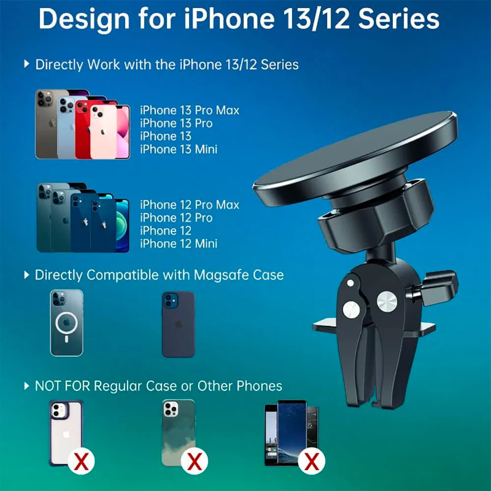 Supporto magnetico per bocchetta di ventilazione con allineamento tipo MagSafe e snodo sferico a 360° per regolare l´angolazione.