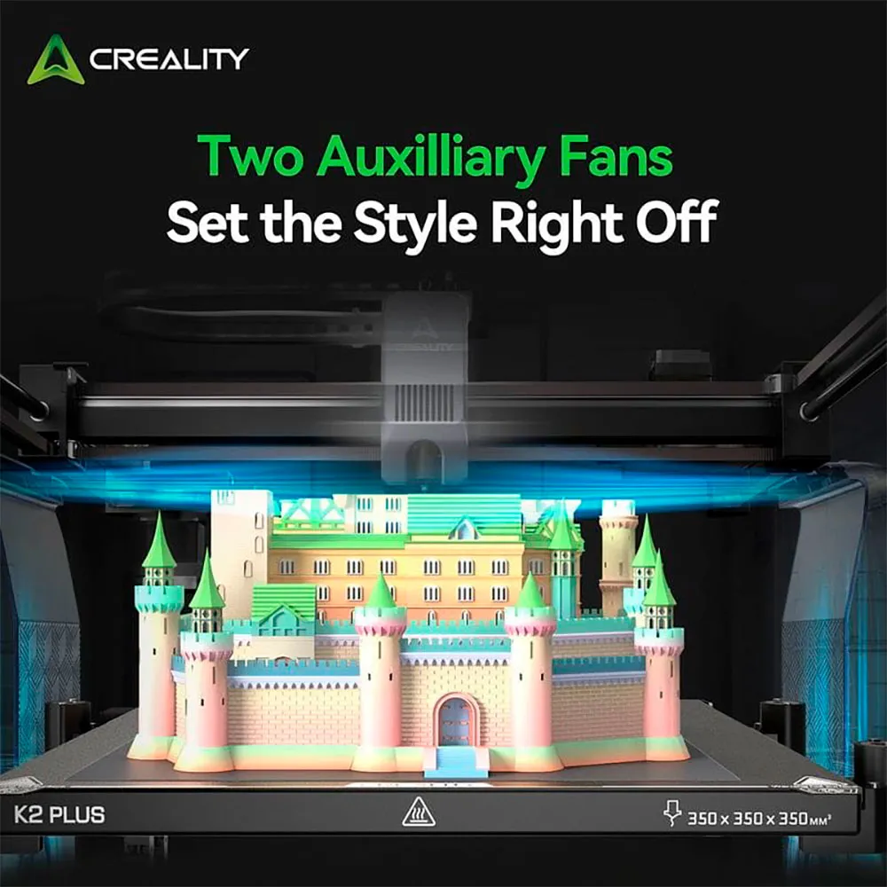 La stampante K2 Plus offre un volume di costruzione di 350x350x350 mm, consentendo di stampare tutti i tipi di oggetti ad alta velocità, raggiungendo i 600 mm/s.