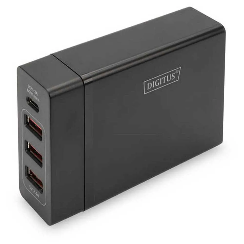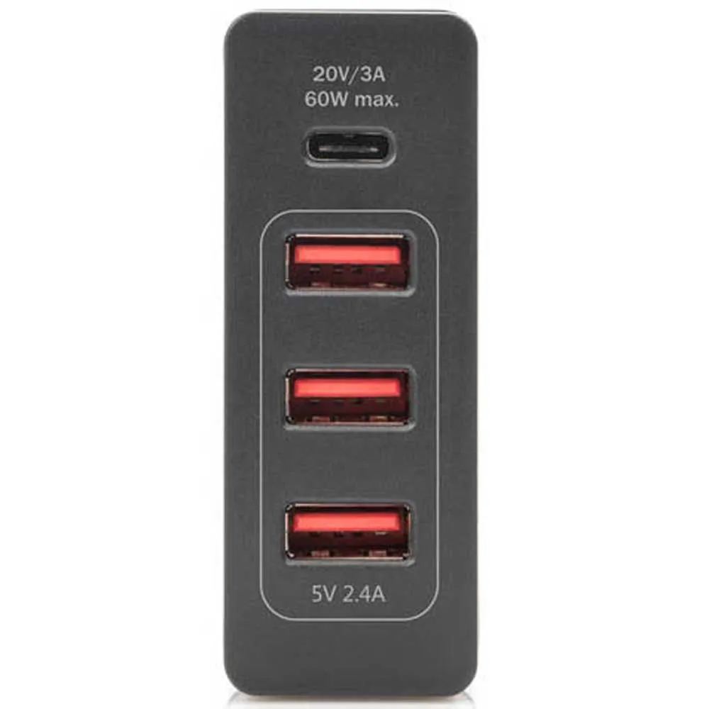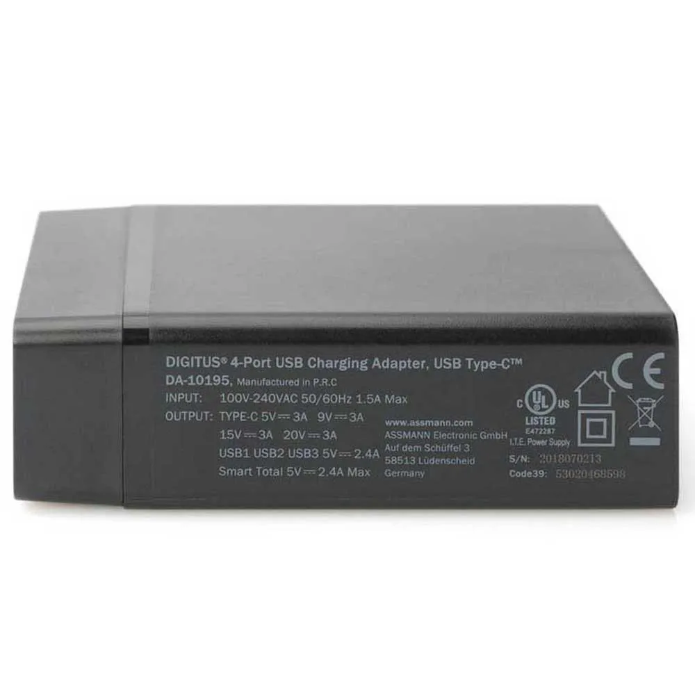 Il caricabatterie Digitus® USB Type C™ a 4 porte è una stazione di ricarica universale per tutti i tuoi dispositivi. La porta di ricarica USB C (da 5 a 20 V / 3 A / 60 W max) con funzionalità Power Delivery (PD) 2.0 consente di caricare in modo rapido ed efficiente Ultrabook, laptop, tablet, smartphone, console di gioco mobili, ecc. Una porta di ricarica (in totale: 5 V / 2,4 A, ogni porta fornisce fino a 5 V / 2,4 A max) consente di caricare tutti i tipi di dispositivi mobili: smartphone, tablet, batterie esterne, altoparlanti, ecc. Offrono il totale potenza di 72 W.