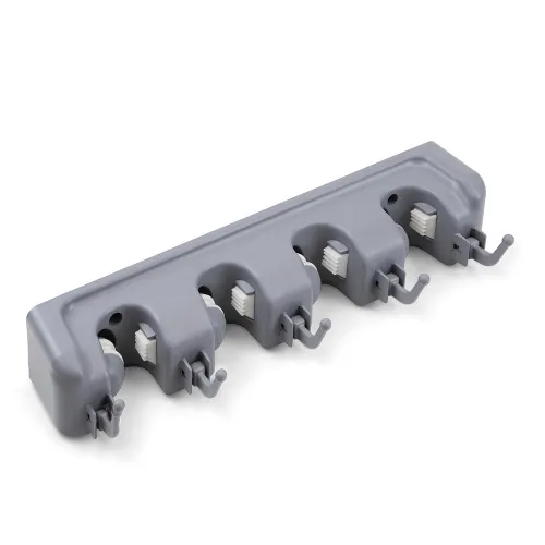 Appendiscope per utensili da pulizia che permette di organizzare in modo pratico la cucina o il ripostiglio e di risparmiare spazio. Ideale per appendere scope, mop, scopette, oltre che strofinacci da cucina grazie ai suoi 4 alloggiamenti e 5 ganci. Gli alloggiamenti sono dotati di sfere rotanti che si adattano allo spessore del manico della scopa o del mop e li mantengono saldamente tenuti. Per sganciarli è molto semplice, basta sollevare leggermente il manico della scopa. Molto facile da installare con viti incluse. Realizzato in plastica altamente resistente con finitura grigia.