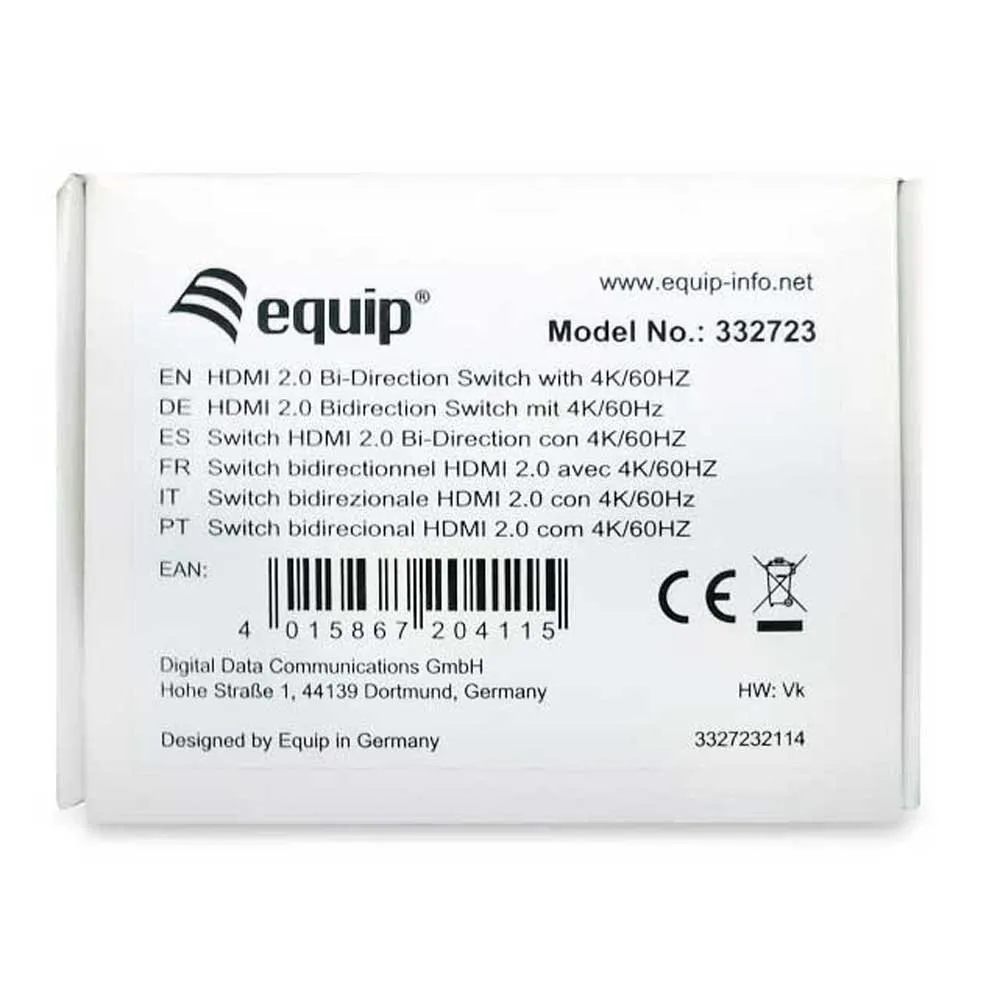Espandi senza sforzo la connettività del tuo TV, monitor o proiettore con lo Switch HDMI a 3 porte EQUIP 332723. Progettato per l´intrattenimento domestico e le configurazioni d´ufficio moderne, questo adattatore compatto e potente risolve il problema comune di avere troppe poche porte HDMI per la tua crescente collezione di dispositivi. Basta con il fastidio costante di collegare e scollegare i cavi e semplifica la tua vita digitale. Sia che tu stia collegando una console di gioco, un lettore Blu-ray, un dispositivo di streaming e un laptop a un singolo schermo, questo switch offre una soluzione fluida e di alta qualità.