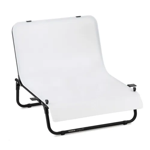 Tavolo di ripresa compatto per la fotografia di piccoli oggetti senza uno sfondo che interferisca. Composto da un telaio tubolare in acciaio pieghevole e un foglio di plastica traslucido bianco con bordo anteriore preformato. Facile installazione e smontaggio senza bisogno di attrezzi, spazio di archiviazione salvaspazio. Telaio di base con piedini antiscivolo.