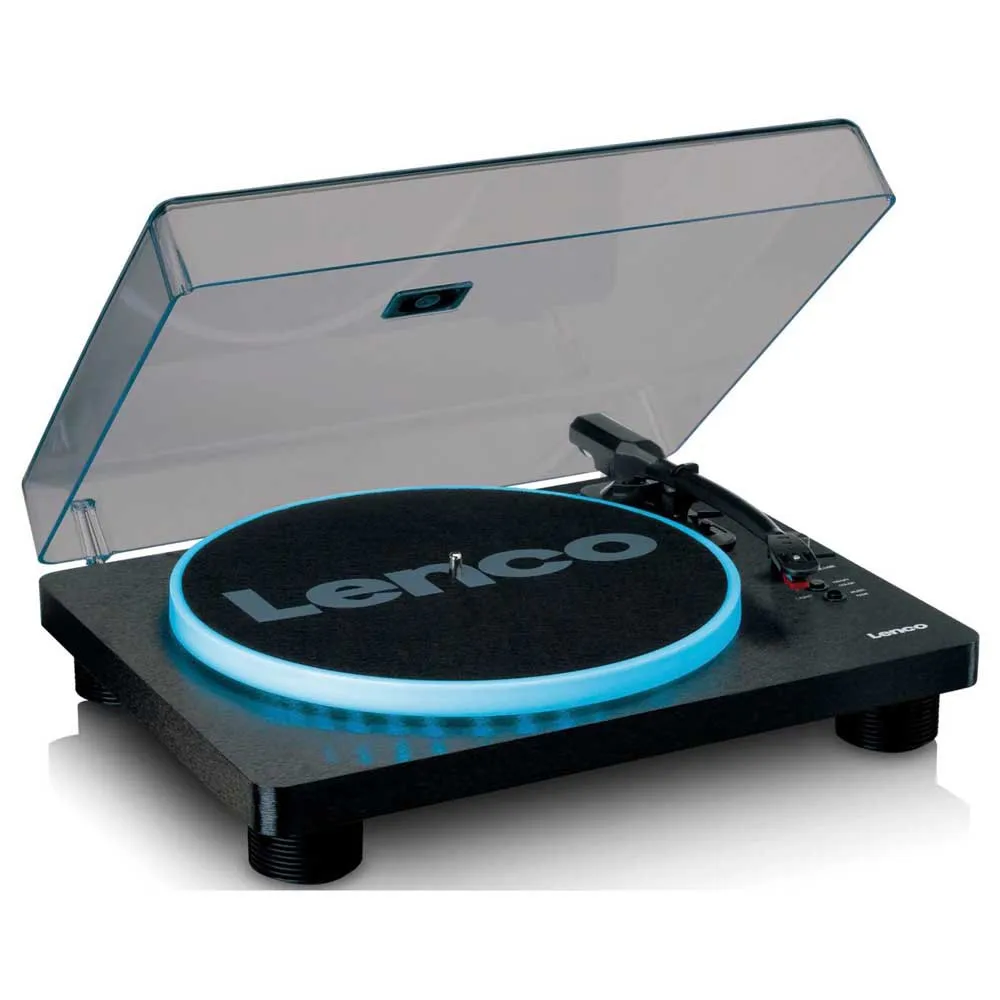Questo moderno giradischi ha due altoparlanti integrati e un´illuminazione a LED sul giradischi.