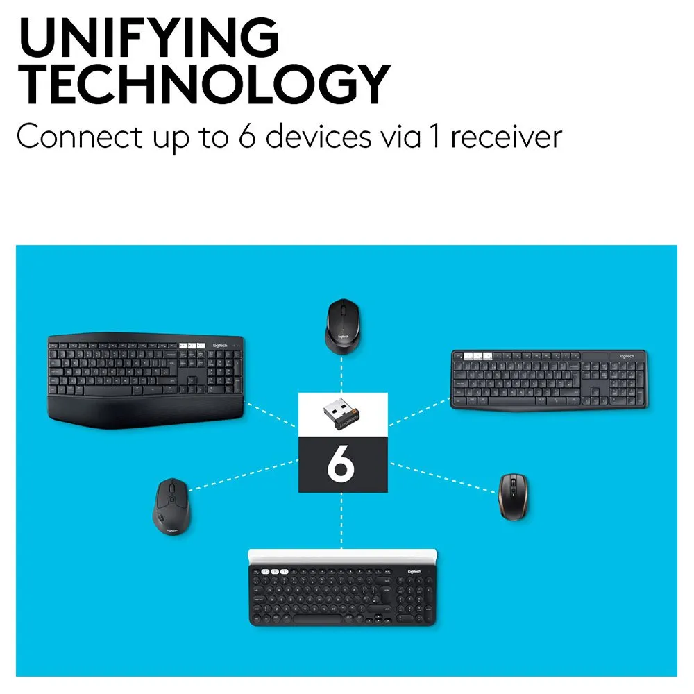 Logitech® Unifying Receiver, il piccolo ricevitore wireless che rimane nel vostro notebook e consente di aggiungere dispositivi quando ne avete bisogno. Collegalo. Dimenticalo. Aggiungi ad esso. Ulteriori informazioni sul ricevitore Logitech Unifying.